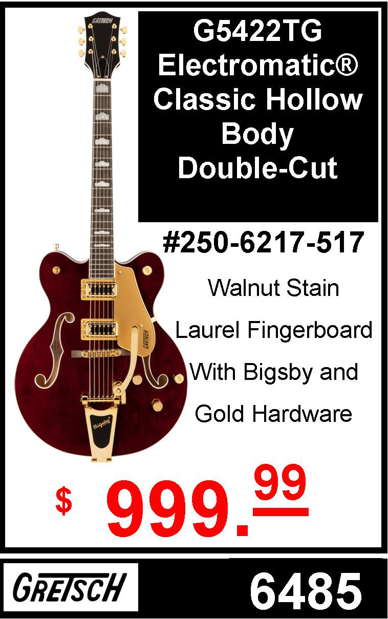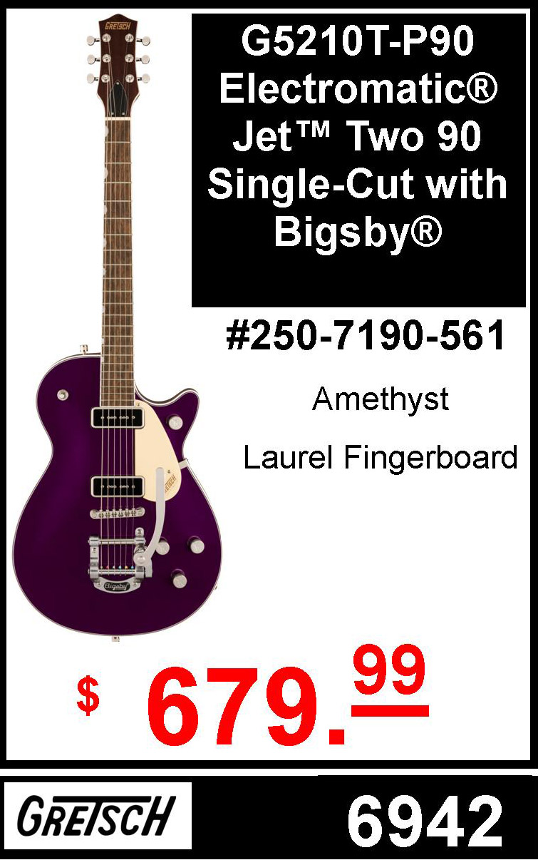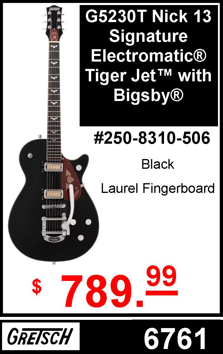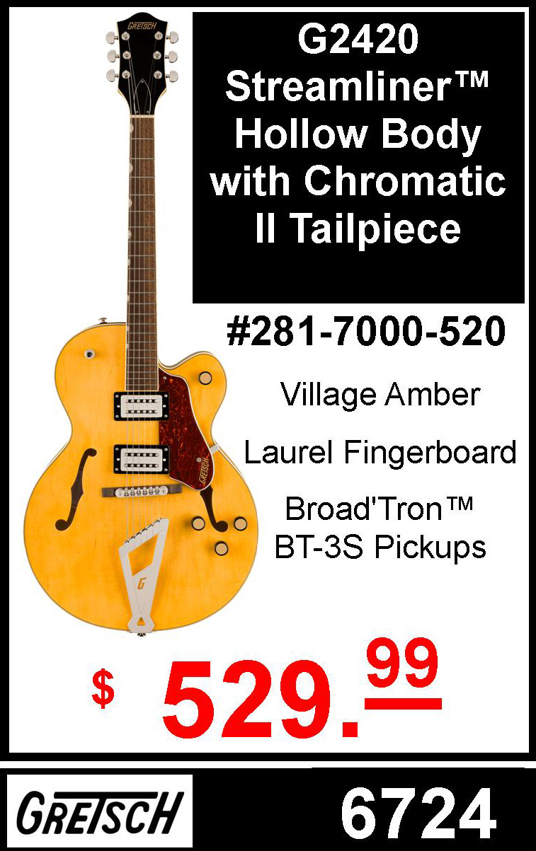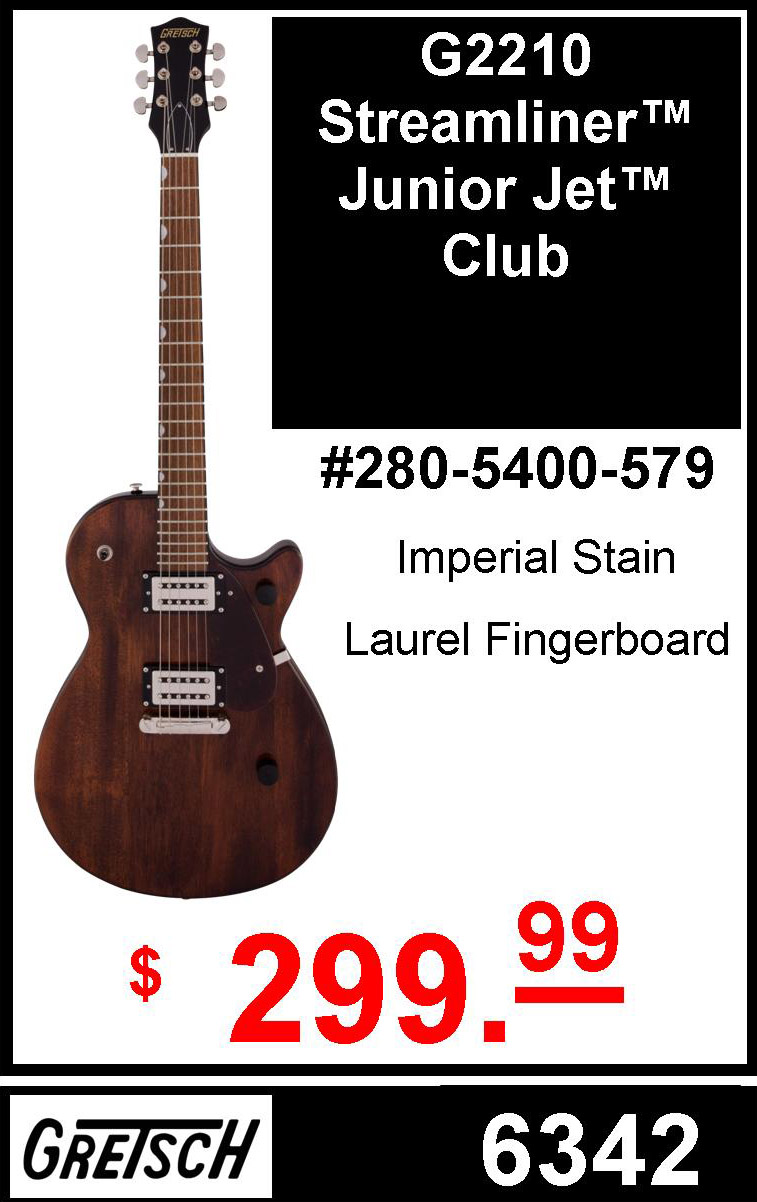 GRETSCH ELECTRIC GUITARS 2805400579 - Gretsch G2210 Streamliner Junior Jet Club Guitar - 299.99 2817000520 - Gretsch G2420 Streamliner Holly Body with Chromatic II Tailpiece Guitar - 529.99 2807205570 - Gretsch G2420T Streamliner Hollow Body with Bigsby Guitar - 629.99 2507190561 - Gretsch G5210T-P90 Electromatic Jet Two 90 Single-Cut with Bigsby Guitar - 679.99 2508210595 - Gretsch Electromatic Double Jet FT with Bigsby Guitar - 379.99 2508310506 - Gretsch G5230T Nick 13 Signature Electromatic Tiger Jet with Bigsby - 789.99 2506217517 - Gretsch G5422TG Electromatic Hollow Body Classic Double Cut Guitar - $999.99