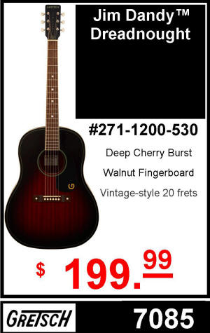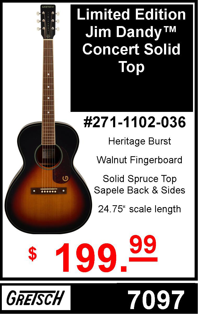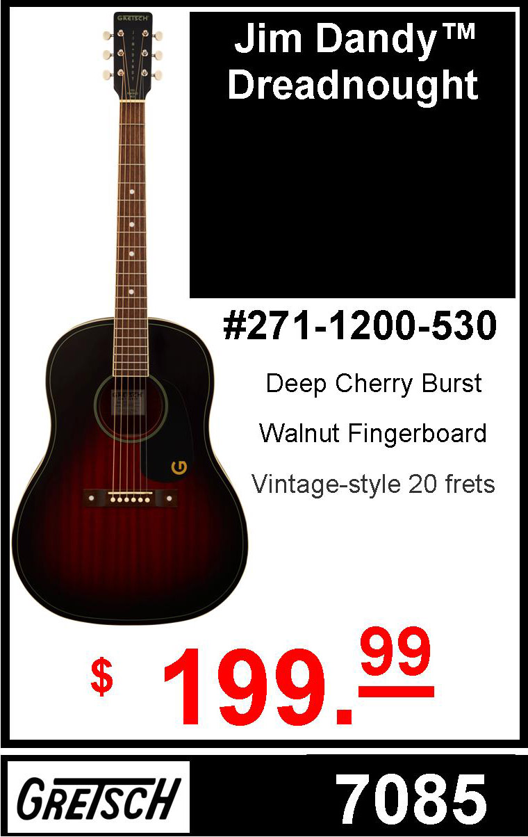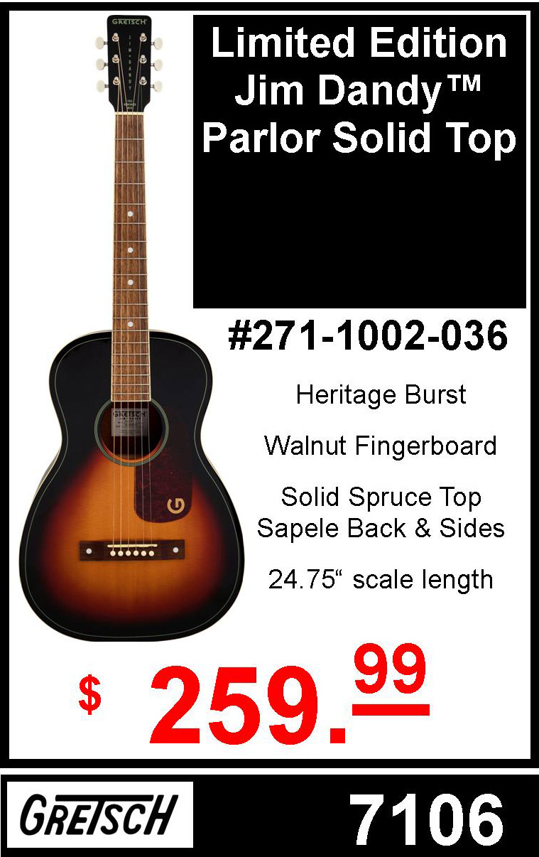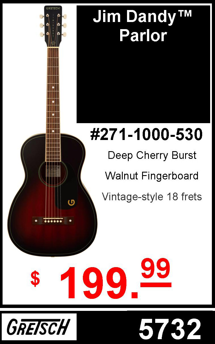 GRETSCH ACOUSTIC GUITARS 2711000530 - Gretsch Jim Dandy Guitar - 199.99 2711102036 - Gretsch Limited Edition Jim Dandy Concert Solid Top Guitar - 199.99 2711200530 - Gretsch Jim Dandy Dreadnought Guitar - $199.99 2711002036 - Gretsch Limited Edition Jim Dandy Parlor Solid Top Guitar - $259.99 2714014556 - Gretsch G5021E Rancher Penguin Parlor Acoustic Electric Guitar - $579.99