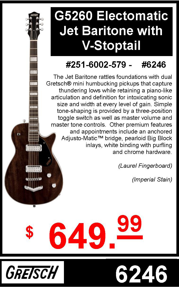 TN-300 GRETSCH ELECTRIC GUITARS 251-6002-579 Gretsch G5260 Electromatic Jet Baritone Guitar with V-Stoptail (Imperial Stain) - $649.99