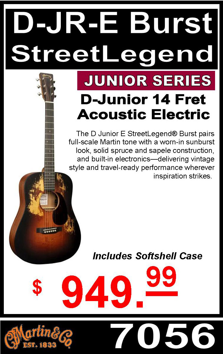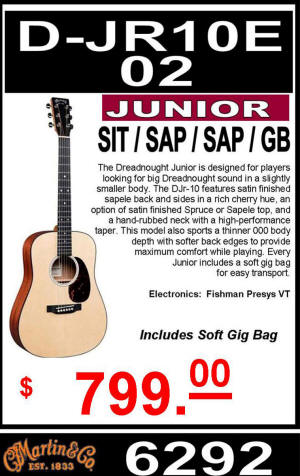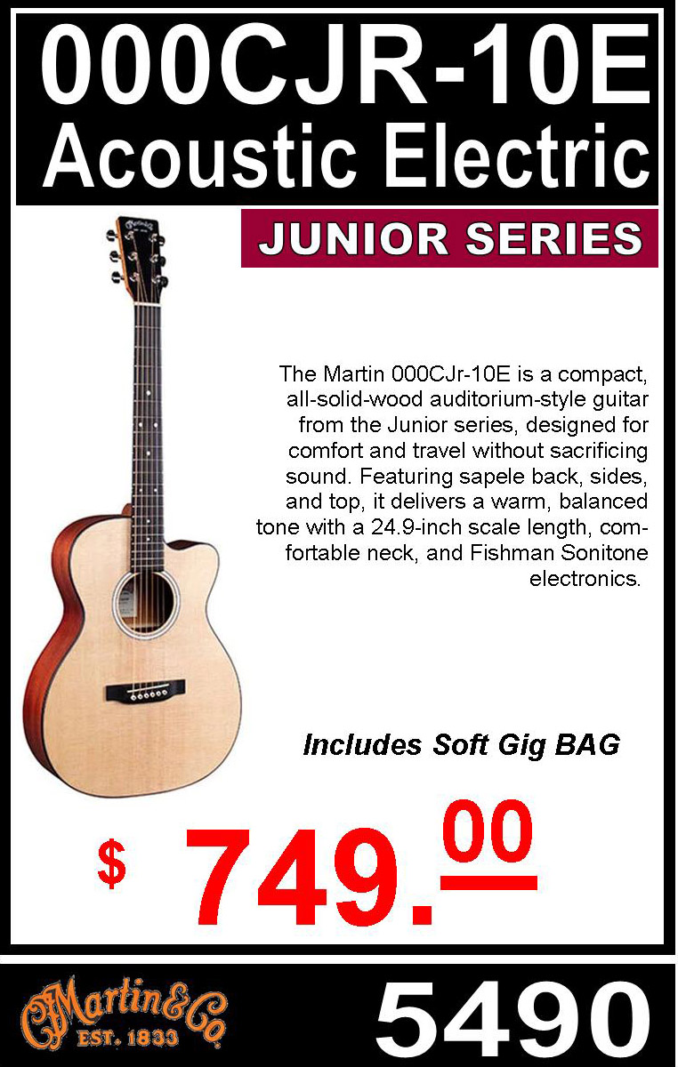 JUNIOR Series (Includes Soft Gig Bag) Martin 000CJR-10E Junior Series Acoustic Electric Guitar with Soft Gig Bag - $749.00 Martin D-JR10E-02 Junior Series Acoustic Electric Guitar with Soft Shell Bag - $799.00 Martin 000CJR-10E Junior Series Acoustic Electric Bass Guitar with Soft Gig Bag - $849.99 Martin D-JR-E Burst StreetLegend Junior Series Acoustic Electric Guitar with Soft Shell Case - $949.99