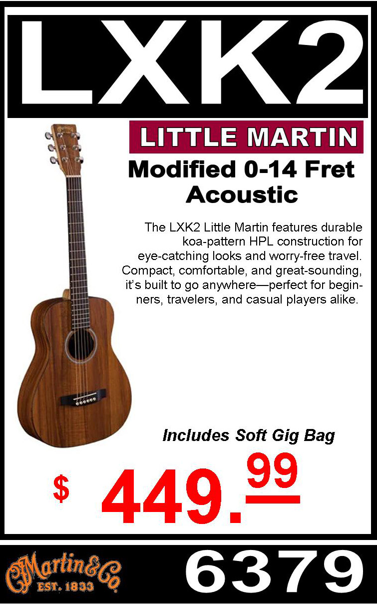 Little Martin Series (Includes Soft Gig Bag) Martin LXK2 Koa Little Martin Series Guitar with Soft Gig Bag - $449.00 Backpacker Series (Includes Padded Gig Bag) Martin Backpacker Steel String with Gig Bag - $319.00